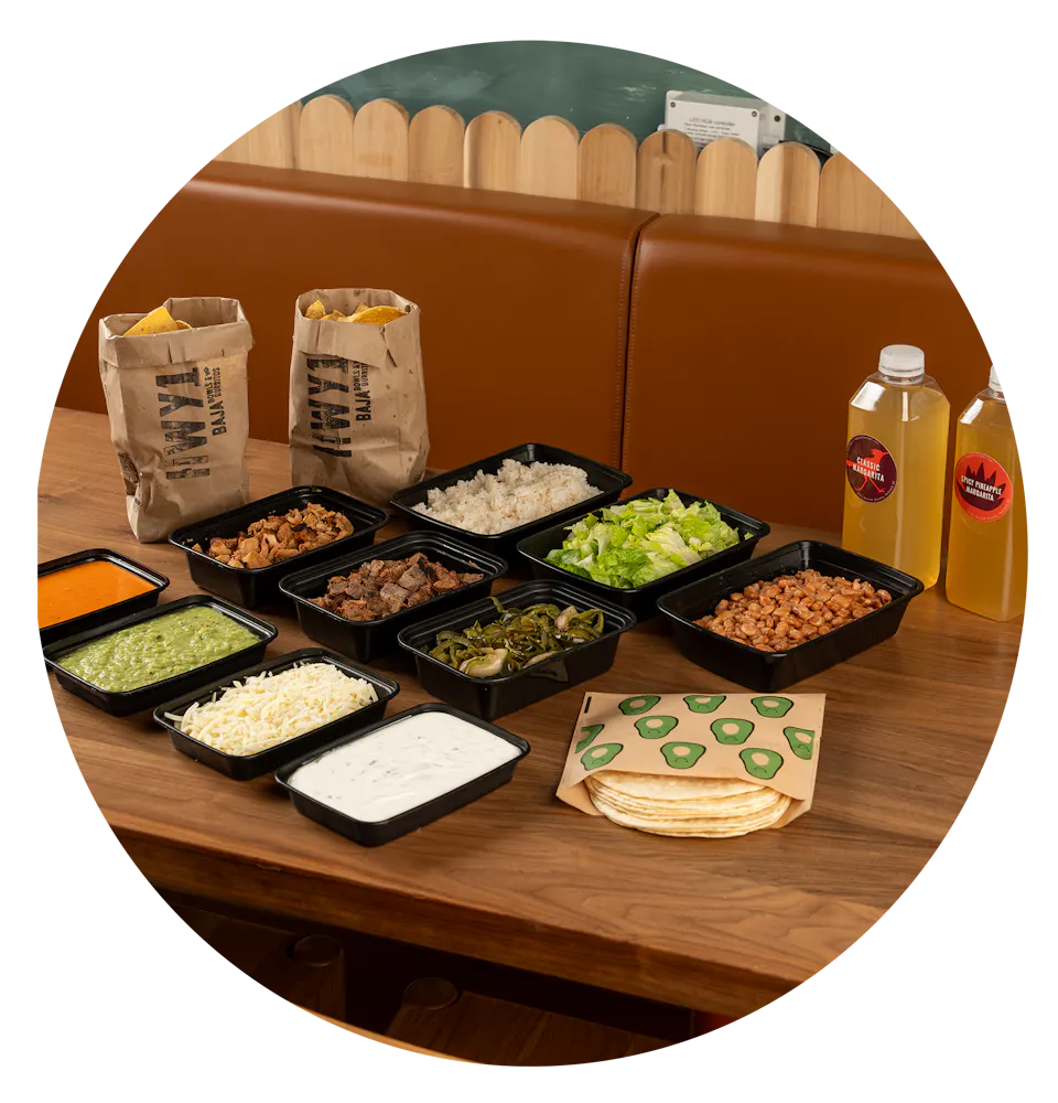 Cruise into mealtime with our Family Pack— fresh, colorful, and built for sharing. Choose two proteins, layer in rice, beans, and veggies, then pile on the toppings. We’ll pack it up with flour tortillas, chips, and plenty of extras so everyone at the table can build their perfect baja bowl, salad, or tacos.