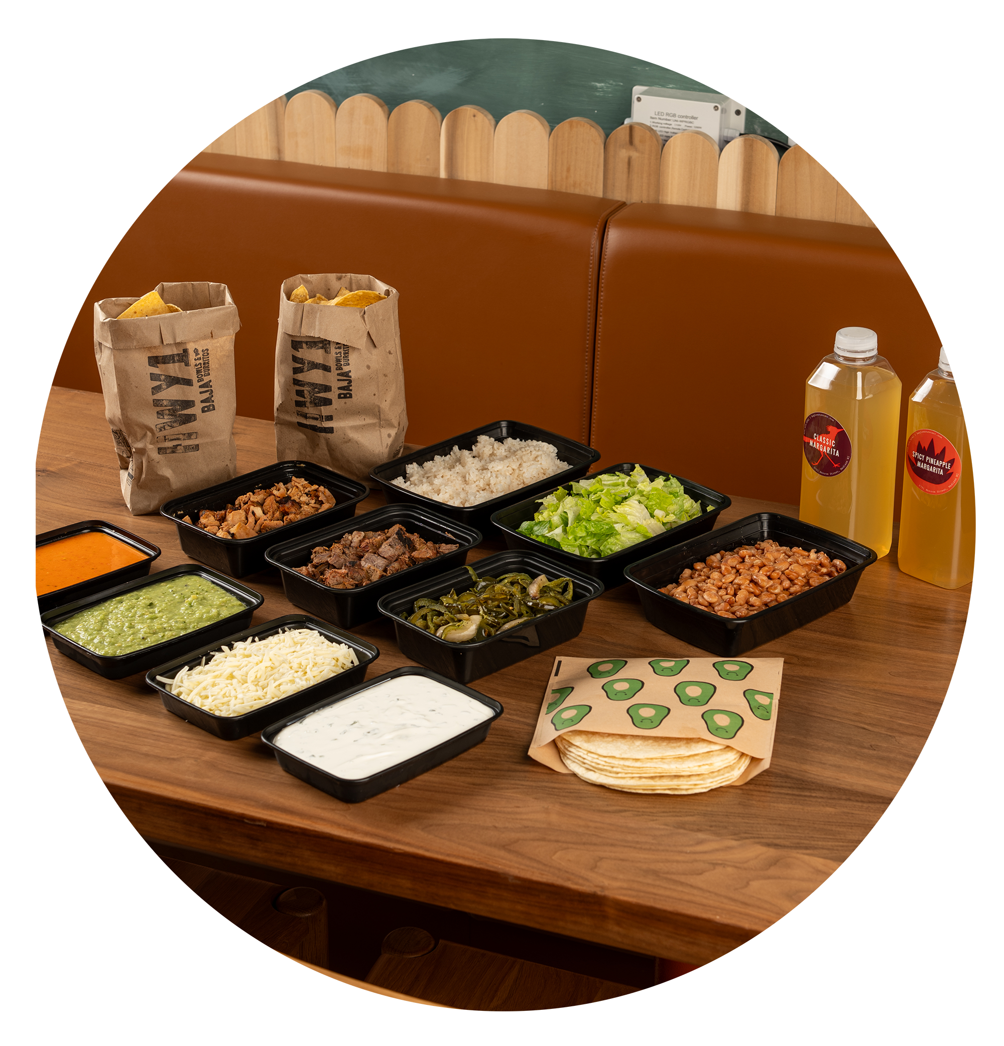Cruise into mealtime with our Family Pack— fresh, colorful, and built for sharing. Choose two proteins, layer in rice, beans, and veggies, then pile on the toppings. We’ll pack it up with flour tortillas, chips, and plenty of extras so everyone at the table can build their perfect baja bowl, salad, or tacos.